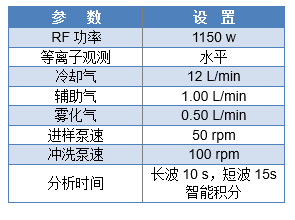 儀器:ICP-5000等離子體原子發射光譜儀;雙向觀測(水平+垂直),分析參數見表1。進樣系統:旋流霧化室、玻璃同心霧化器。前處理設備: Mill-Q超純水機。