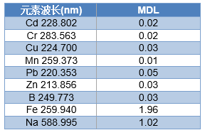 注:方法檢出限=3倍標準偏差×稀釋倍數 (Cd、Cr、Cu、Mn、Pb、Zn:1 g到25 mL;B、Fe、Na:1 g到2500 mL)