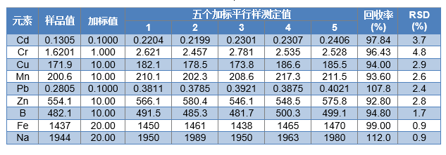 表4某肥料樣品重金屬元素的方法精密度和加標回收率 單位:mg/Kg