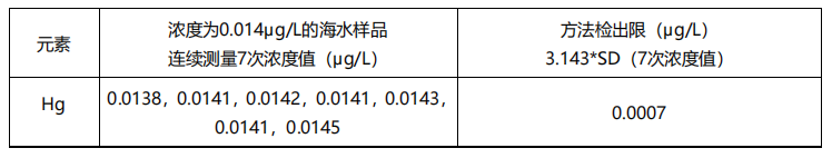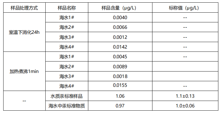 根據國標GB3097-1997《海水水質標準》,可按照海域的不同使用功能和保護目的將海水分為四類,汞的限量值分別為0.05 μg/L、0.2 μg/L、0.2 μg/L 和0.5 μg/L。其中國標GB17378.4-2007海洋檢測規范 第4部分:海水分析,規定了海水中汞的分析方法,第一法即為原子熒光法。