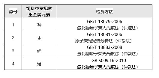 為防止重金屬元素在飼料中的濫用,根據 GB 13078-2017 《飼料衛生標準》、GB 26418-2010 《飼料中硒的允許量》、GB 26434-2010 《飼料中錫的允許量》等對一些常見的重金屬元素添加劑量和試驗方法進行了明確的規定。