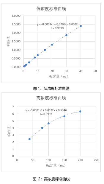 汞標準系列溶液:準確吸取汞標準使用液(10.0mg/L),用重鉻酸鉀-硝酸溶液(0.5g/L)逐級稀釋成濃度為0.0μg/L、10.0μg/L、20.0μg/L、40.0μg/L、80.0μg/L、160.0μg/L、200.0μg/L、400.0μg/L、600.0μg/L 和 800.0μg/L的低濃度系列標準溶液;準確吸取汞標準使用液(100.0mg/L),用重鉻酸鉀-硝酸溶液(0.5g/L)逐級稀釋成濃度為 0.80mg/L、1.6mg/L、2.0mg/L、3.0mg/L 和 4.0mg/L 的高濃度系列標準溶液。