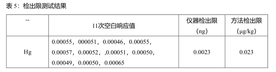 以重鉻酸鉀-硝酸溶液(0.5g/L)作為空白溶液,對空白溶液進行 11 次響應值的測量,每次進樣 40μL,根據測試結果計算其標準偏差 S,根據公式 K S DL / 3 ? ? 計算儀器檢出限。儀器檢出限為 0.0023ng,當取樣量為 0.10g 時,方法檢出限為 0.023μg/kg,詳細結果見表 5。