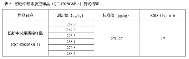 通過對奶粉中總汞質控樣品(QC-4202038B-4)進行分析測試,驗證儀器準確性,平行測定 6 次,測定值均在標準值范圍內,RSD 為 1.7%,詳細結果見表 6。
