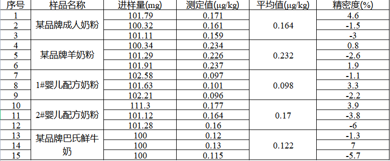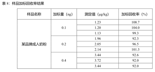 對某品牌成人奶粉樣品采用 0.1ng、0.2ng、0.4ng 三個濃度水平的加標,每個加標濃度水平分別進行 3個樣品加標,加標回收率為 92.0%~108.7%。