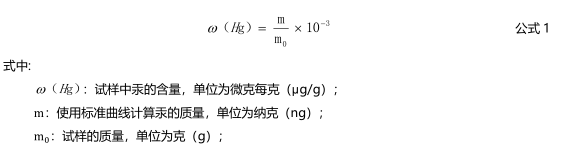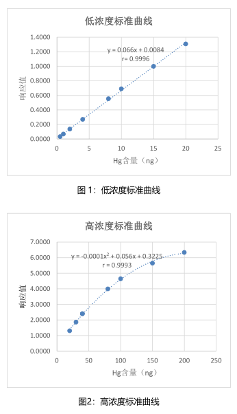 汞標準系列溶液:準確吸取汞標準使用液(10.0mg/L),用重鉻酸鉀-硝酸溶液(0.5g/L)逐級稀釋成濃度為0.0μg/L、10.0μg/L、20.0μg/L、40.0μg/L、80.0μg/L、160.0μg/L、200.0μg/L 和 400.0μg/L 的低濃度系列標準溶液;準確吸取汞標準使用液(100.0mg/L),用重鉻酸鉀-硝酸溶液(0.5g/L)逐級稀釋成濃度為 0.40mg/L、0.60mg/L 、0.80mg/L、1.6mg/L、2.0mg/L、3.0mg/L 和 4.0mg/L 的高濃度系列標準溶液。