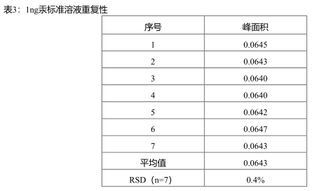 汞標準使用液(100ng/mL)每次進樣 10μL,絕對質量為 1ng,連續測試 7 次,重復性統計見表 3。