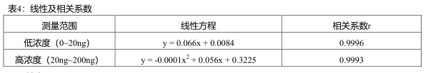 5.2.2 高濃度標準曲線: 分別吸取 50μL 低濃度標準溶液系列于樣品舟中,高濃度標準系列汞含量分別為20.0 ng、30.0 ng、40.0ng、80.0 ng、100.0 ng、150.0 ng、200.0 ng,以汞含量為橫坐標,測得的響應值為縱坐標,繪制高濃度標準曲線,線性見圖 2,線性方程及相關系數見表 4。