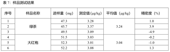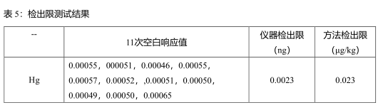 以重鉻酸鉀-硝酸溶液(0.5g/L)作為空白溶液,對空白溶液進行 11 次響應值的測量,每次進樣 40μL,根據測試結果計算其標準偏差 S,根據公式 K S DL / 3 ? ? 計算儀器檢出限。儀器檢出限為 0.0023ng,當取樣量為 0.10g 時,方法檢出限為 0.023μg/kg,詳細結果見表 5。