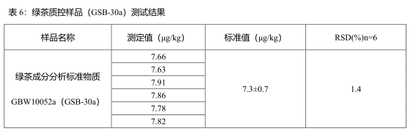 對綠茶成分分析標準物質 GBW10052a(GSB-30a)進行分析測試,驗證儀器準確性,平行測定 6 次,測定值均在標準值范圍內,RSD 為 1.4%詳細結果見表 6。