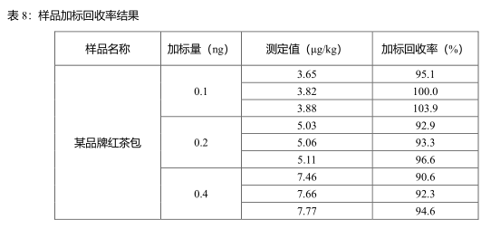 對紅茶包采用 0.1ng、0.2ng、0.4ng 三個濃度水平的加標,每個加標濃度水平分別進行 3 個樣品加標,加標回收率為 90.6%~103.9%,加標回收率結果詳見表 8。
