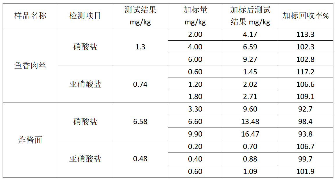 本文所述的預制菜中硝酸鹽和亞硝酸鹽分析方法,是使用北京吉天儀器有限公司的iFIA7全自動多參數流動注射分析儀測定,此方法測試硝酸鹽線性相關系數為0.9999;硝酸鹽定量重復性為 0.37%;硝酸鹽加標回收率為92.7%-113.3%,亞硝酸鹽線性相關系數為0.9999;亞硝酸鹽定量重復性為 0.64%,亞硝酸鹽加標回收率為99.7%-117.2%
