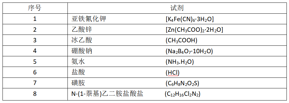亞鐵氰化鉀溶液(106 g/L)、乙酸鋅溶液(220 g/L)、飽和硼砂溶液(50 g/L)、氯化銨緩沖溶液、磺胺顯色劑。