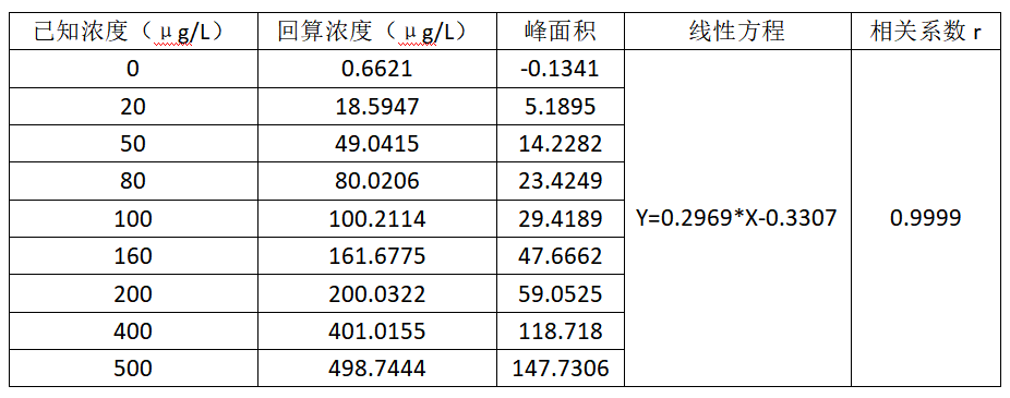 將硝酸鹽標準系列工作液(0μg/L、20μg/L、50μg/L,80μg/L、100μg/L、160μg/L、200μg/L、400μg/L、 500μg/L,以N計)分別進樣,以濃度為橫坐標,峰面積為縱坐標繪制標準曲線,硝酸鹽線性方程及相關系數見表2,標準曲線見圖 1,分析峰型圖見圖2。