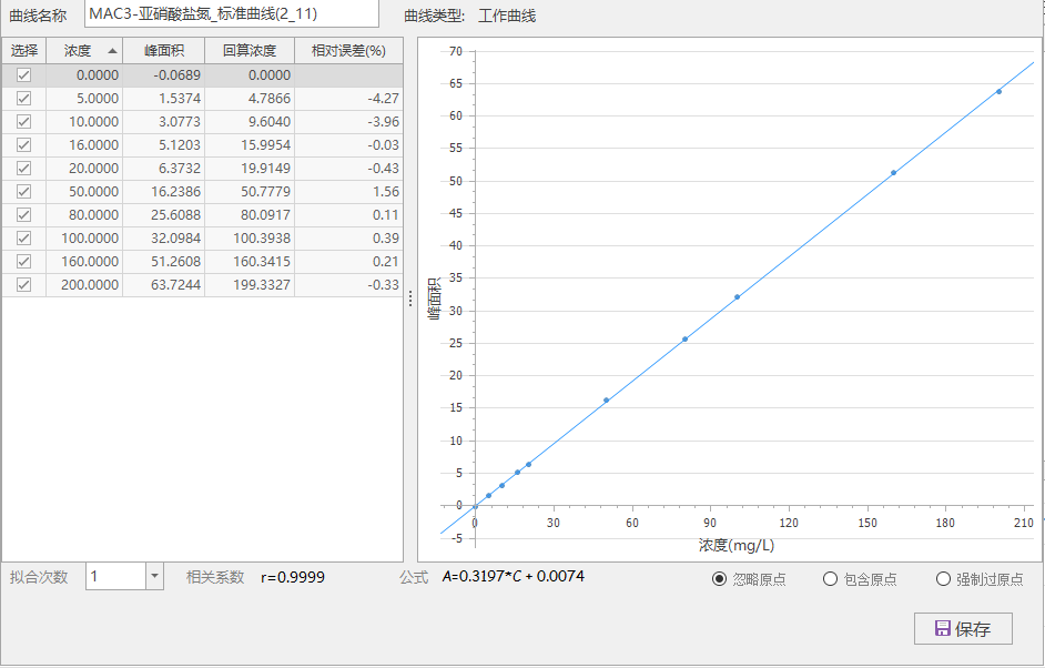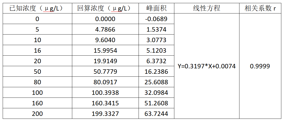 將亞硝酸鹽標準系列工作液(0μg/L、5μg/L、10μg/L、16μg/L、20μg/L、50μg/L、80μg/L、100μg/L、160μg/L、200μg/L,以N計)分別進樣,以濃度為橫坐標,峰面積為縱坐標繪制標準曲線,亞硝酸鹽線性方程及相關系數見表3,標準曲線見圖 3,分析峰型圖見圖4。