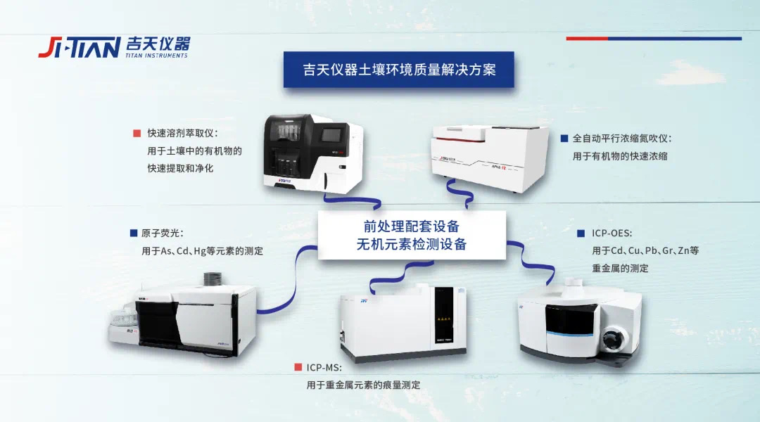 吉天儀器作為生態環境領域的從業者,能夠提供從樣品前處理配套設備到元素分析檢測的解決方案,為土壤環境質量檢測提供有力支持。吉天提供無機產品線檢測儀器原子熒光、ICP-OES、ICP-MS,此外還有與GC、LC以及色譜-質譜等檢測設備配套的自動化快速溶劑萃取儀、全自動平行濃縮氮吹儀。