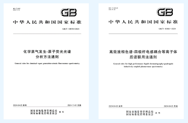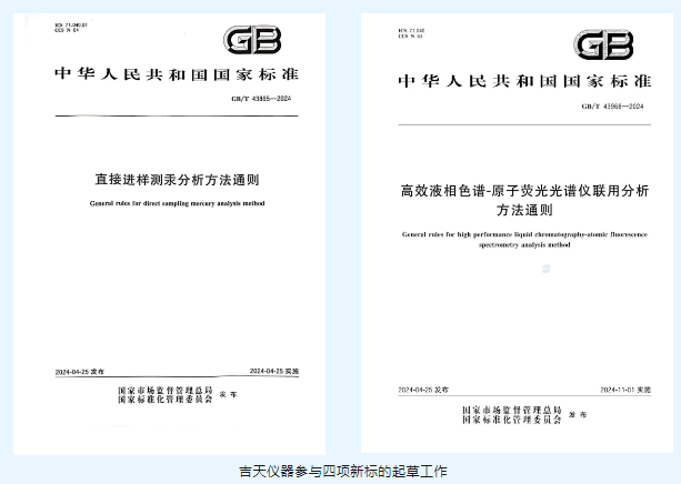 在中國農業科學院農業質量與檢測技術研究所、清華大學的悉心指導下,吉天儀器榮幸參與了GB/T 43970-2024《化學蒸汽發生-原子熒光光譜分析方法通則》(4月25日發布;11月1日實施)、GB/T 43966-2024《高效液相色譜-四極桿電感耦合等離子體質譜聯用法通則》(4月25日發布并實施),GB/T 43865-2024 《直接進樣測汞分析方法通則》(4月25日發布并實施)及GB/T 43968-2024《高效液相色譜-原子熒光光譜儀聯用分析方法通則》(4月25日發布;11月1日實施)等四項國家標準的起草工作。